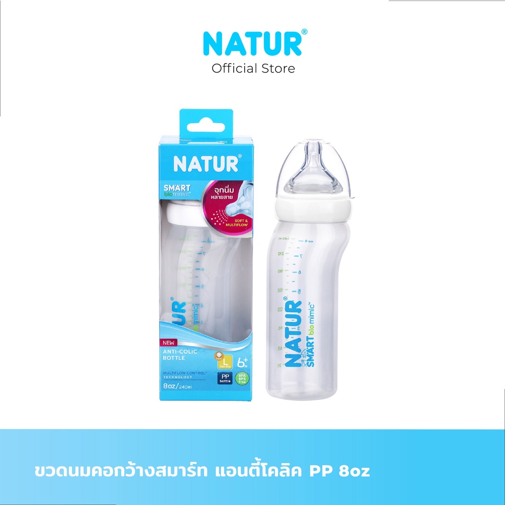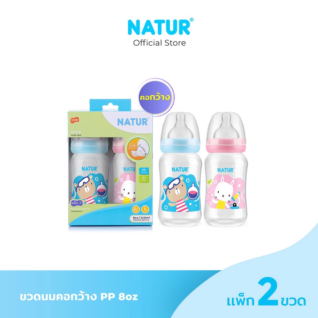 - เนเจอร์ ขวดนมคอกว้าง สไมล์ ขนาด 8oz มาพร้อมกับ จุกนมคอกว้างสไมล์ ไซซ์ L เหมาะสำหรับเด็ก 6+ เดือนขึ้นไป