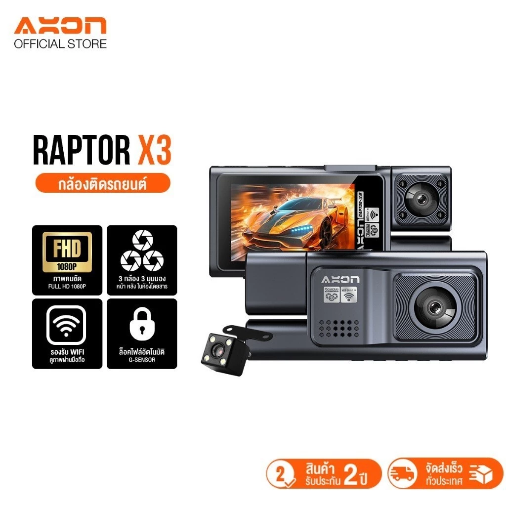 - Axon Raptor X3 กล้องติดรถยนต์ 3 กล้อง เชื่อมต่อ WiFi